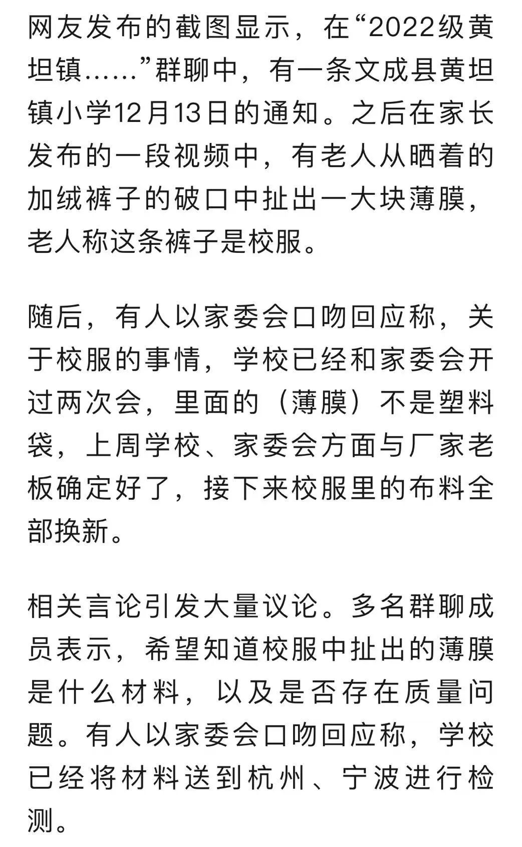 12月17日,黄坦镇中心小学校长回应称,涉事校服产于2021年,厂家质检报告显示薄膜不是塑料,用途是防风防水,校方已再次进行质检,也在排查后续几批校服有无问题。记者从文成县相关部门了解到,针对此事,当地教育、市监等部门已成立联合调查组介入。