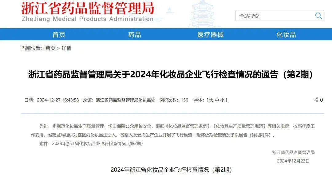 近日,浙江药监局发布关于2024年化妆品企业飞行检查情况的通告。通告显示,此次飞行检查的化妆品企业共39家,涵盖日化、化妆品、气雾剂、指甲油等不同主营业务。