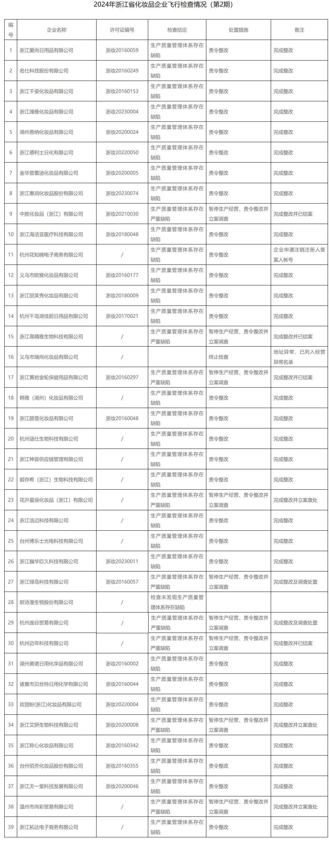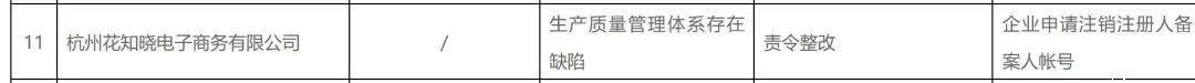 通告显示,检查结论为“生产质量管理体系存在缺陷”的企业共28家,包括花知晓、润培、姬存希、玫丽盼等企业被责令整改。其中,27家均已完成整改,仅杭州花知晓电子商务有限公司所备注的内容是企业申请注销注册人备案人帐号。