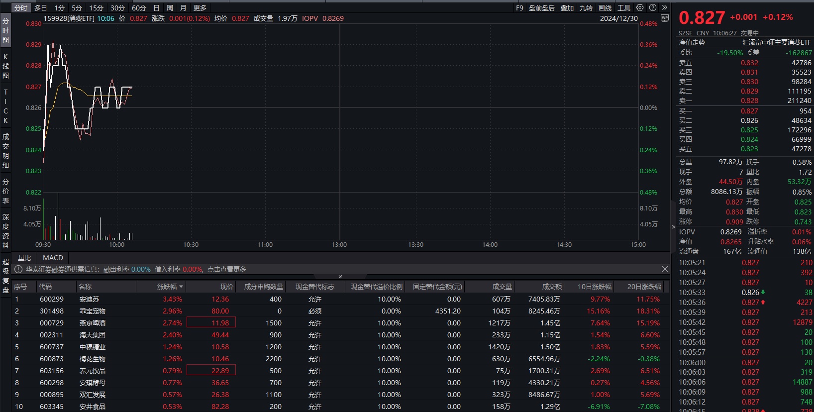 截至发稿,消费ETF(159928)换手率0.58%,成交额超8000万元,溢折率0.01%。