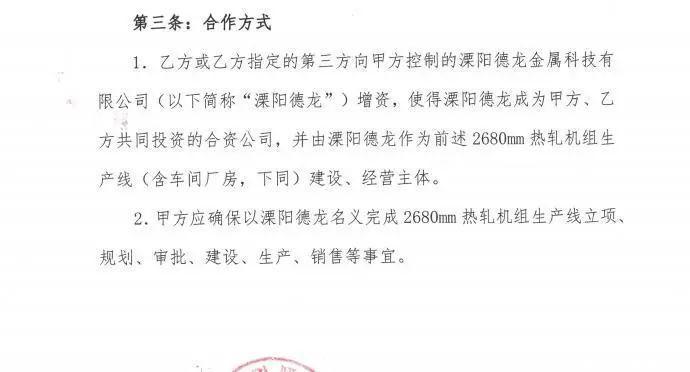 具体来看,2020年,德龙镍业与吉凡实业签署的合作投资协议显示,双方约定共同参与申特系企业重整方案中投资金额不低于30亿元的2680mm热轧机组项目,具体合作方式为吉凡实业方向德龙镍业控制的德龙金属增资,使其成为双方共同投资的合资公司,并由德龙金属作为前述项目的建设、经营主体。