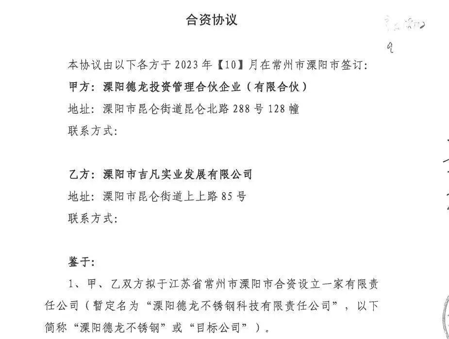 2023年10月,溧阳德龙投资管理合伙企业(有限合伙)与吉凡实业签署合资协议。