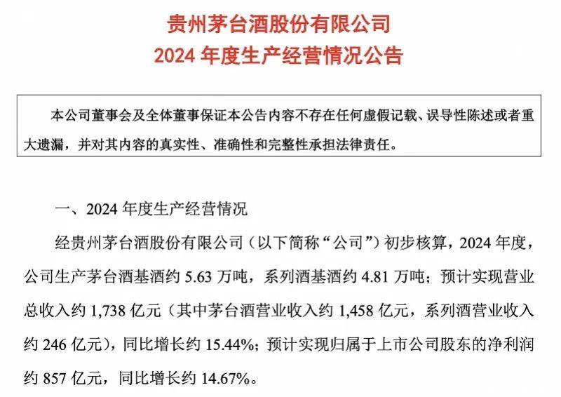 1月2日,南都湾财社-酒水新消费指数课题组记者从贵州茅台方面注意到,该公司已发布《2024年度生产经营情况》公告。公告中,贵州茅台预计公司营业总收入约1738亿元,同比增长约15.44%;归母净利润约857亿元,同比增长约14.67%。